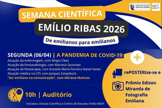 O que comemoramos no dia 11 de abril? Sim, o nascimento do Dr. Emílio Ribas e, portanto, é o Dia do Infectologista. E é por isso que nesta semana (de 6 a 10 de abril) temos uma programação extensa: a 1ª Semana Científica Emílio Ribas. Todos os dias, às 10h, teremos mesas redondas multiprofissionais discutindo o que viven- ciamos com a aids, a covid, estratégias vacinais, IRAS e "infecções urbanas”.Tam-bém refletiremos sobre alguns aspectos do que é "ser emiliano...", sem esquecer que o Prêmio de Fotografia e a exposição rePOSTERize-se também fazem parte das comemorações. Prestigie!